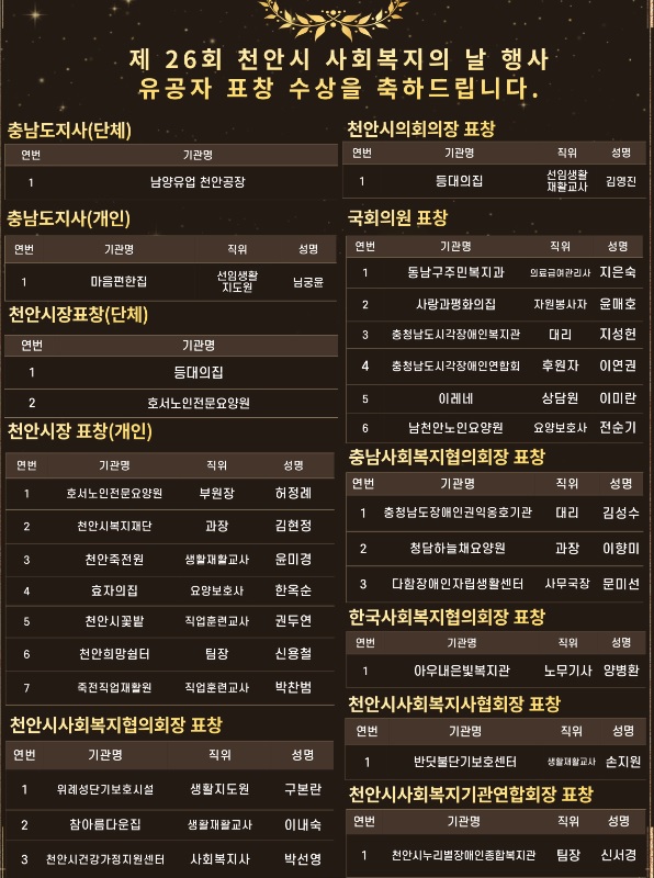 제 26회 천안시사회복지의 날 행사 유공자 표창수상 페이지 정보 작성자작성자 : 천사협 조회조회수 : 547회 작성일작성일 : 25-09-23 13:14 본문 수상을 축하 드립니다! 목록 다음글「제26회 천안시사회복지의 날 행사」사회복지 유공자 추천 협조 요청 25.07.28